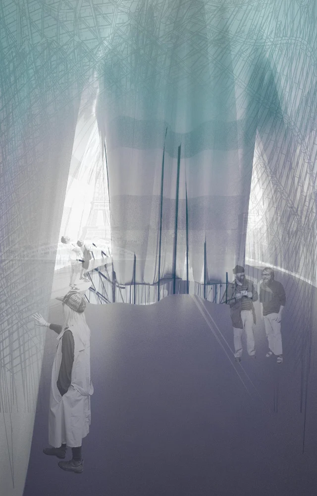 Developing the idea of bubbling, liquid champagne in a flute into an inhabitable form, the project seeks to meld together a solid. grounded form with an amorphous, flowing one. borrowing from both spirit and physicality to yield the concept. A structural steel frame covered in ETFE allows for an interior experience that plays with light and ranges from transparent to opaque depending on the exterior and interior conditions. The structure consists of a steel frame that supports the floor plates and the ETFE interior/exterior shell. The center core brings in light and acts as the main circulation center. This was a solo entry for [AC-CAi's[P ARISC) hampagne Bar Competition.